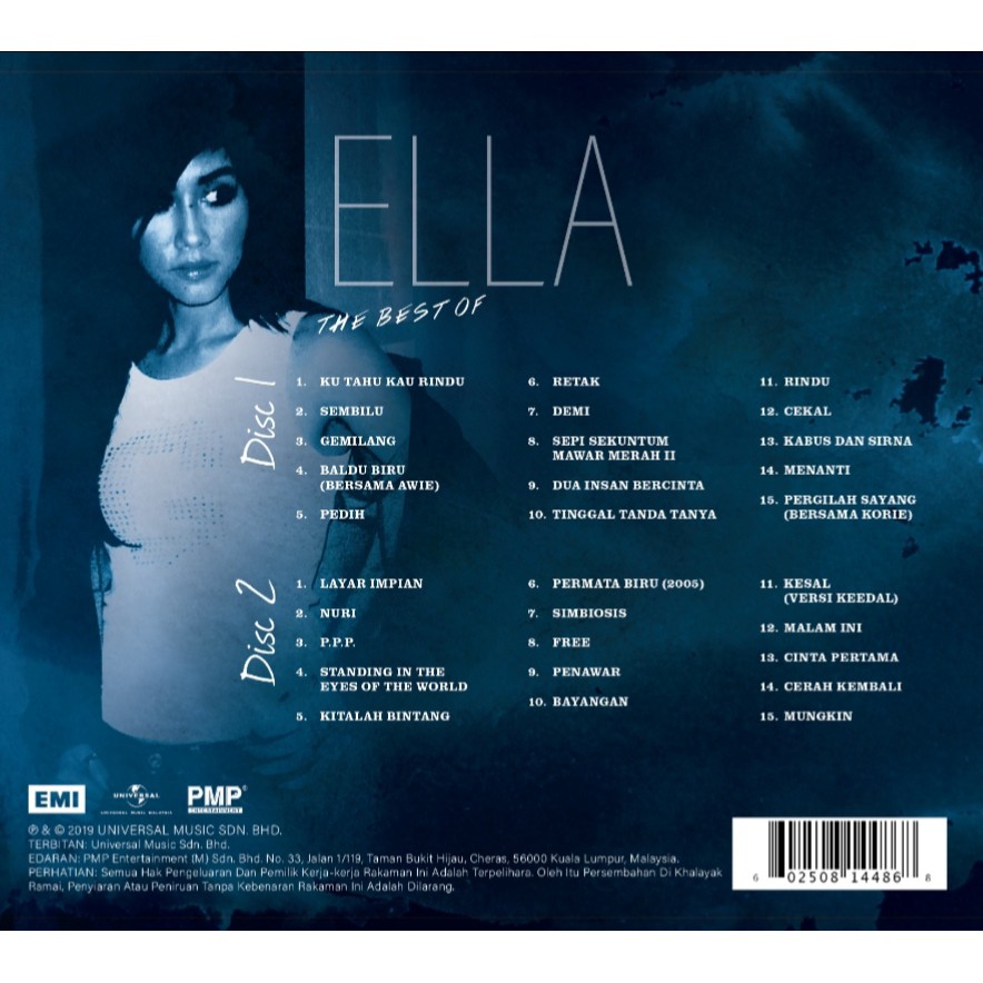Sejenak ku Teringat Saat Manis Dulu Semadi Di Hati Ku. EL Ella 2014 Greatest Hits 2019 Identiti 1990 Ilham Bicara 2018 Koleksi Lagu Lagu Terbaik 2014 Koleksi Terbaik 1991 Nada Pesona 2016 PeaceLoveRindu 2017 Puteri Kota 1990 Puteri Rock 2002 Rama Rama 2007 Simbiosis 2003 Singles and EPs Siri Bintang Pujaan Remastered 2015 The Best Of 2019 USA 2014 Unggul 1993 Baldu Biru Dua Insan Bercinta. Anggaplah Baldu Biru Semurni Cinta Ku Kepada Mu.